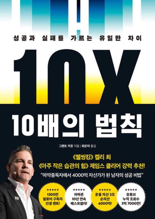 각 종 SNS와 유튜브 동기부여의 전설이 된 그 책 10배의 법칙의 저자 그랜트 카돈 마약중독자에서 4000억 원의 자산가가 될 수 있었던 단 하나의 성공 방식 절판되어 판매가 되지 않다가 리셀가 30만 원까지 갔었던 책이 시중에 나온 지 1년이 되었네요. 카돈이 가장 강조하는 단어는 행동력인데요. 그래서 행동력에 관한 목차를 마지막에 다뤄 보도록 하겠습니다. 많은 사람들이 큰 성공을 하고 싶어 합니다. 그러나 대부분 사람들이 성공을 하지 못합니다. 카돈은 그 이유를 이렇게 말합니다 당신은 "충분히 행동하지 않았다"입니다. 당신의 유일한 문제는 재능이 아니라 이름 없음이다. 당신의 시도가 성공하게 하려면 지속적으로 끈질기게 노력해야 한다고 말합니다. 엄청난 수준으로 행동을 한다고 한들 당신이 피해를 보는 경우는 절대로 없을 것이다. 오히려 언제나 그 행동은 당신에게 도움이 되어 돌아온다, 즉 질보다 양이 더 중요하다는 이야기다.라고 말합니다. 10배의 법칙에서 전하는 단 하나의 메시지는 엄청나게 행동하면 성공할 수밖에 없다입니다. 과연 이 말을 모르거나 반박할 수 있는 사람이 있을까 싶은데요. 그런데 아는 만큼 행동을 하고 계시나요. 행동을 하고 나서 결과가 나오기까지는 꾸준함이 필요합니다. 그런데 결과가 나오기도 전에 지레 포기를 하게 되면 더 이상 노력할 기회조차 없어진다는 이야기입니다. 그렇게 되면 점점 스스로에 대한 믿음이 떨어집니다. 그러니 충분히 행동을 하지 못합니다.