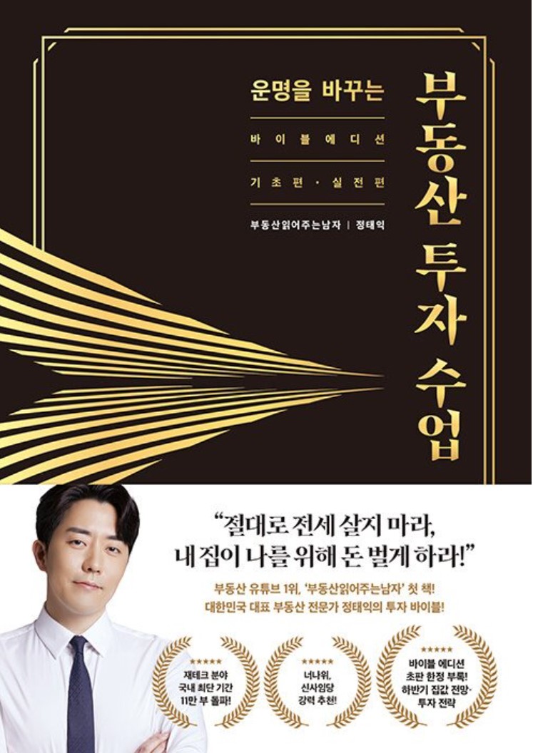현 부동산 유튜버이자 저의 동기부여를 도와주신 정태익 부읽남님의 도서를 소개해드리기 위해 가지고 왔습니다. 부동산 투자수업이라 부동산이라는 말이 들어가면 어려울 것 같다는 생각이 많이 들 수 있습니다. 하지만 이 책을 읽고 요약을 했으니 한번 읽어보시고 내용이 괜찮다고 느껴지시면 가까운 도서관이나 서점에서 구매를 하셔서 꼭 읽어보시길 추천드립니다. 이 책을 읽고 난 후 행동을 한다면 책에 나와있는 내용대로 운명이 바뀔 수 있으니 꼭 한번 읽어보시길 추천합니다. 그럼 책을 함께 읽어보겠습니다.